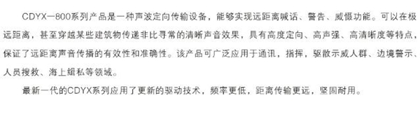 ? ? ? ▼動(dòng)亂、暴亂、騷亂現(xiàn)場(chǎng),暴徒喪心病狂,受蠱惑的群眾也可能情緒失控,警察法規(guī)說(shuō)教不可能動(dòng)搖其心理防線,動(dòng)槍動(dòng)棒恐傷無(wú)辜,釋放催淚瓦斯又有失人道,而“聲霸”精準(zhǔn)瞄準(zhǔn)其骨干分子,高分貝施壓,使起聽(tīng)覺(jué)神經(jīng)無(wú)力招架,被迫撤離,既能有效控制局面,平息大亂,又不致命、致傷、致殘,彰顯文明執(zhí)法。