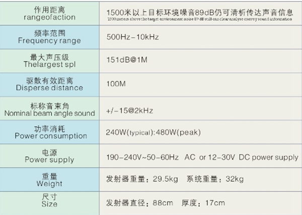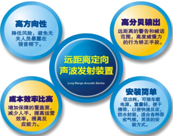 與傳統(tǒng)的擴音系統(tǒng)比較,遠距離定向聲波發(fā)射裝置是一種革命性的新技術(shù)。它具有非常的遠射功力,可以將聲音信息清晰地傳遞到數(shù)百米以外,甚至能穿越某些建筑物;它具有強大的震懾威力,可以逼迫受眾自動離開禁入?yún)^(qū)域;它具有精準的定向能力,可以瞄準一定角度發(fā)射難以承受的刺激性聲波,而在其它角度卻無不適。